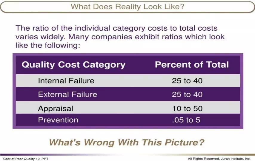 ในบรรดาต้นทุนด้านคุณภาพทั้งหมด ต้นทุนจากความล้มเหลวภายนอกเป็นต้นทุนที่แพงที่สุด สมาคมคุณภาพแห่งอเมริกาประเมินว่าต้นทุนคุณภาพต่ำโดยเฉลี่ยของบริษัทที่ประสบความสำเร็จอยู่ที่ประมาณ 10-15% ของค่าใช้จ่ายในการดำเนินงานทั้งหมดอย่างไรก็ตาม ในกรณีที่เลวร้ายกว่านั้น ต้นทุนเหล่านี้อาจสูงถึง 40% ของค่าใช้จ่ายทั้งหมดของธุรกิจ ดังนั้น การใช้ COQ อาจเป็นประโยชน์อย่างยิ่งในการลดต้นทุน