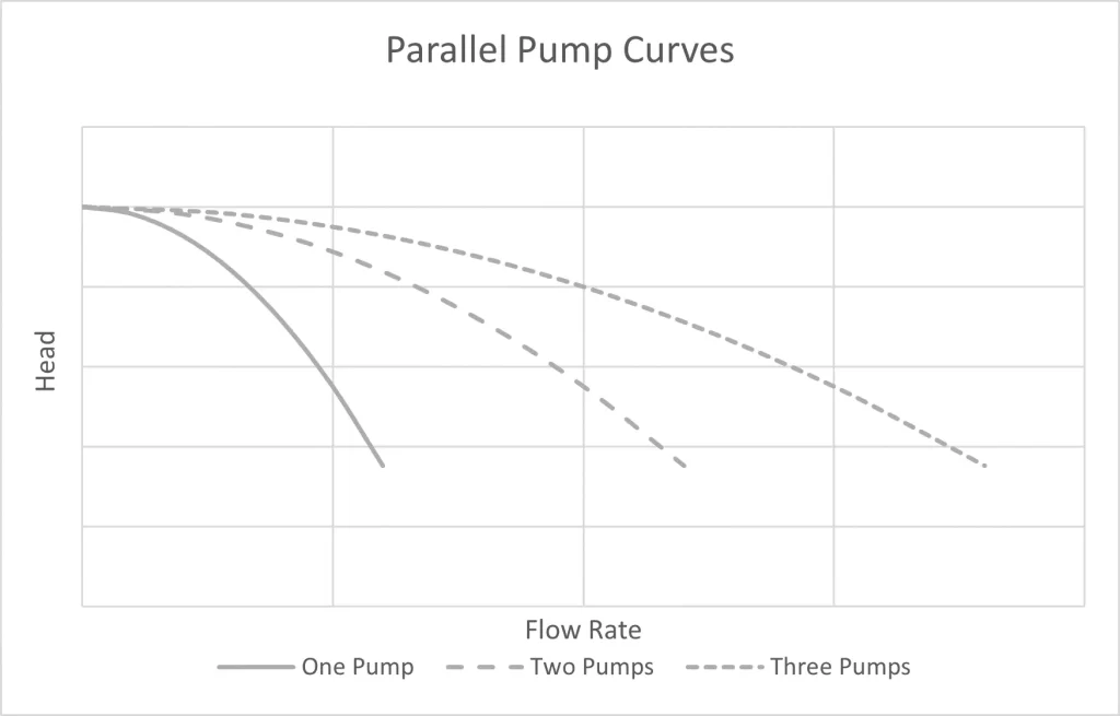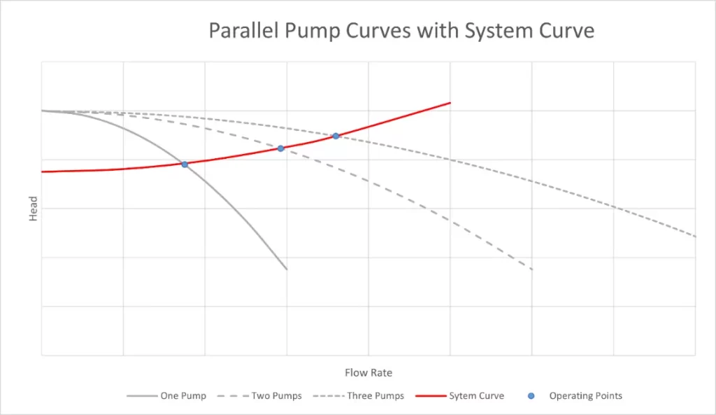 ปริมาณการไหลที่เพิ่มขึ้นในระบบขึ้นอยู่กับทั้งรูปร่างของกราฟระบบและรูปร่างของกราฟปั๊ม กราฟปั๊มรวมจะตัดกับกราฟระบบที่จุดการทำงานต่าง ๆ ซึ่งส่งผลให้เกิดอัตราการไหลที่แตกต่างกัน เมื่อมีการใช้งานปั๊มเพิ่มขึ้น การไหลก็จะเพิ่มขึ้นตามไปด้วยครับ