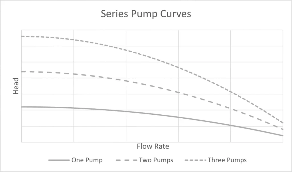 ในขณะที่ปั๊มที่วางแบบขนาน (parallel) จะช่วยเพิ่มปริมาณการไหลที่ความดันหัวเท่าเดิมเมื่อเทียบกับปั๊มตัวเดียว ปั๊มที่วางแบบอนุกรม (series) จะช่วยเพิ่มความดันหัวที่ปริมาณการไหลเท่าเดิม