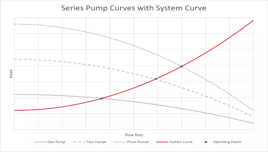 กราฟปั๊มรวมที่แสดงปั๊มแบบอนุกรมสามารถสร้างขึ้นได้โดยการนำค่าความดันหัวของปั๊มแต่ละตัวมาบวกกันที่ปริมาณการไหลเดียวกัน การนำค่าผลรวมนี้มาแสดงในปริมาณการไหลต่าง ๆ จะได้กราฟปั๊มรวมสำหรับกลุ่มปั๊มดังกล่าว รูปที่ 3 แสดงกราฟปั๊มรวมสำหรับปั๊มขนาดเท่ากันสองและสามตัวที่ทำงานแบบอนุกรมครับ