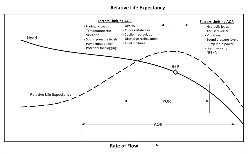 - POR คือช่วงอัตราการไหลที่อยู่รอบๆ BEP ที่ประสิทธิภาพและความน่าเชื่อถือของปั๊มยังไม่ลดลงมาก