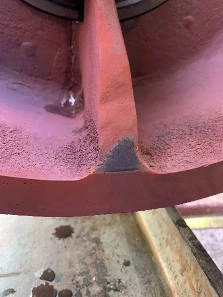 รูปแสดงความเสียหายจากการสัมผัสกัน (Contact Damage) บนตัวแยกการไหลของสเปเซอร์ด้านดูด (Suction Spacer Flow Splitter) และรูปคราบแคลเซียมและน้ำขังอยู่บริเวณสตัด (stud) จำนวนสามตำแหน่ง ซึ่งเป็นสาเหตุให้สมรรถนะของปั๊มตกต่ำ